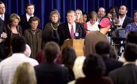The next day, a closed meeting with Henry Kissenger and more meetings with New Mexicans; talk was of peace and what Kissenger had said. Then more paperwork, reviewing legislation and drafting correspondence. Sundays belong to his kids. They go to church, then the zoo or a large park with a playground. Washington seems very different from New Mexico. Even though it rains in New Mexico once in a while, Albuquerque's winters are usually a little brighter. The problems of getting settled in the new job seem great, but not ones that time wouldn't help. I have more than a twenty-year gap in pictures. Though I saw and met with the Senator on several occasions during this time, I was not actively photographing. Domenici received the political endorsements from several Albuquerque area police organizations, Oct. 9, 1996, as he campaigned for his fifth term. In the 1996, race he defeated Bernalillo County Democratic Party chairman, Art Trujillo, Green Party candidate Abraham J. Gutmann, and Libertarian Bruce M. Bush. Domenici, with a halo, spoke to the media during Heather Wilson’s June 23, 1998, victory celebration of her special Congressional election to fill the unexpired term of Congressman Steve Schiff, who had died in office. Domenici was the strongest supporter of Wilson. Domenici held Wilson’s arm high in a victory celebration on June 23, 1998. From the left are: her son Josh, her husband Jay Hone, Wilson, Domenici, then to the right are the late Dee Johnson and her husband, then Gov. Gary Johnson. Wilson had been Johnson’s cabinet secretary of New Mexico’s Children, Youth and Families Department before running. She defeated former State Senator Phil Maloof. During that event, there already was talk about Domenici grooming Wilson to eventually take his seat in the Senate. Domenici, center, stands with several of the 2006 Republican candidates at a Bernalillo County Republican Party Bar-B-Q. Domenici implored support for fellow Republican candidates. Domenici helped dedicate the Department of Agriculture’s Forest Service’s newly consolidated Albuquerque Service Center for Human Capital Management Office, Nov. 1, 2006. With him are: U.S. Department of Agriculture Secretary Mike Johanns, left, senior Rep. Wilson, along with Undersecretary Mark Rey, right, who is in charge of the Forest Service.