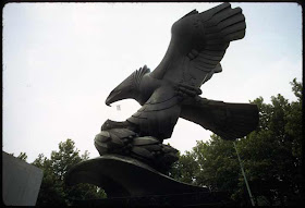 Someone planted a flag in the beak of this statue located in Battery Park at the south tip of Manhattan Island is a tribute fallen soldiers. This picture was taken August 13, 1969, after the ticker-tape parade for the Apollo 11 astronauts in New York City. Talk about dancing in the streets.