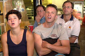 Watching television news at Saggio's, from left, junior Sierra Stockdale, Martin McEnery, graduate student Chris Niles, and Associate Professor Rob Robergs react to terrorist attacks in Washington D.C., and New York City Tuesday.
