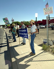 Wava Porter-Kilby, right, of November Coalition for Albuquerque and Santa Fe, graduate student Ryan Davis, and Frank Scaltrito, of NORML, hold a "drug war vigil" across the street from the Continuing Education Building during a debate on drug policy.
