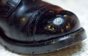 His military bearing is not at all hampered, as evidenced by the mirrored spit-polished shine on his combat boots, which reflect the glass ceiling in the rotunda.